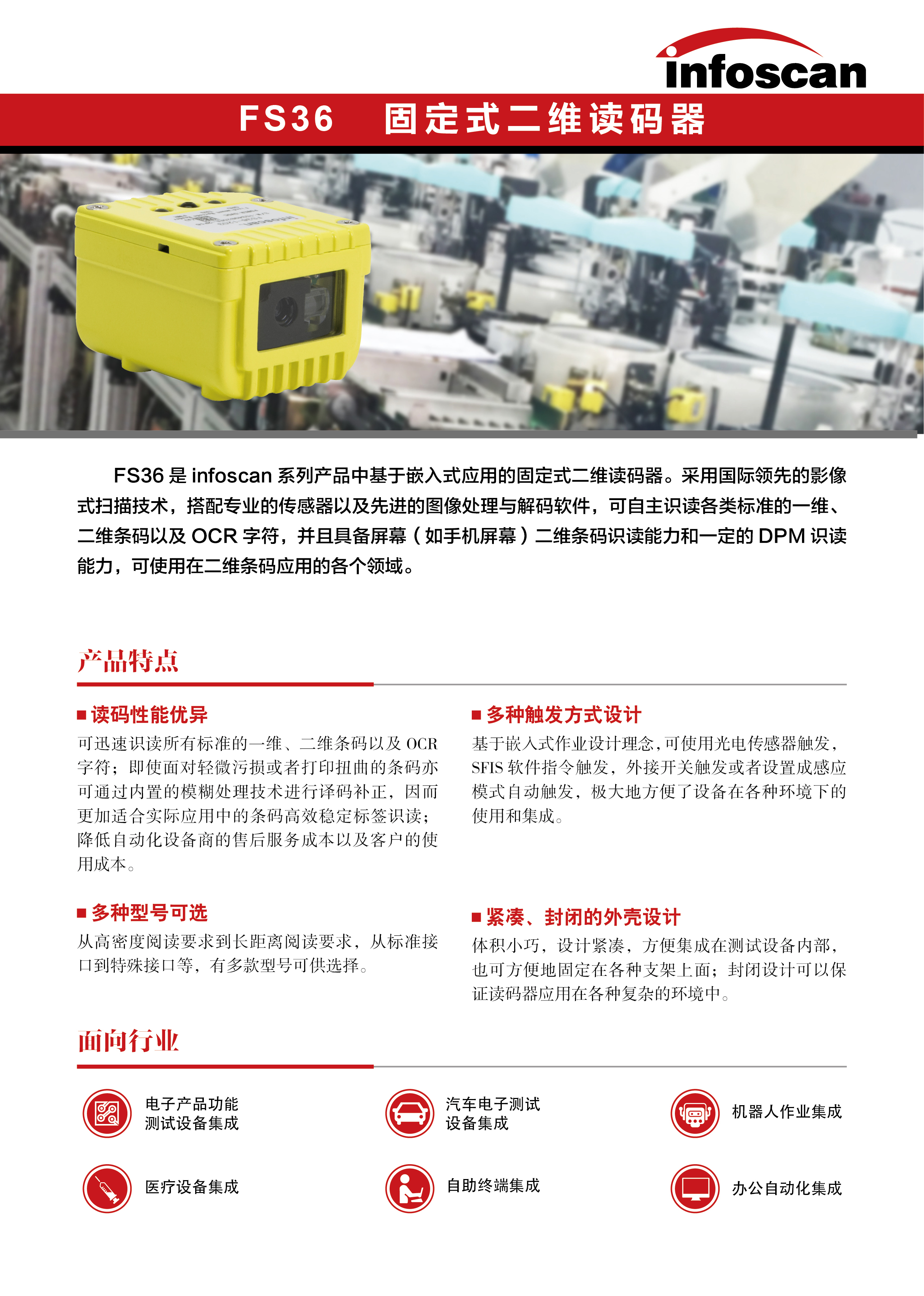 InfosanFS36是 infoscan 系列產(chǎn)品中基于嵌入式應(yīng)用的固定式二維讀碼器。采用國際領(lǐng)先的影像式掃描技術(shù),搭配專業(yè)的傳感器以及先進(jìn)的圖像處理與解碼軟件,可自主識(shí)讀各類標(biāo)準(zhǔn)的一維、二維條碼以及 OCR 字符,