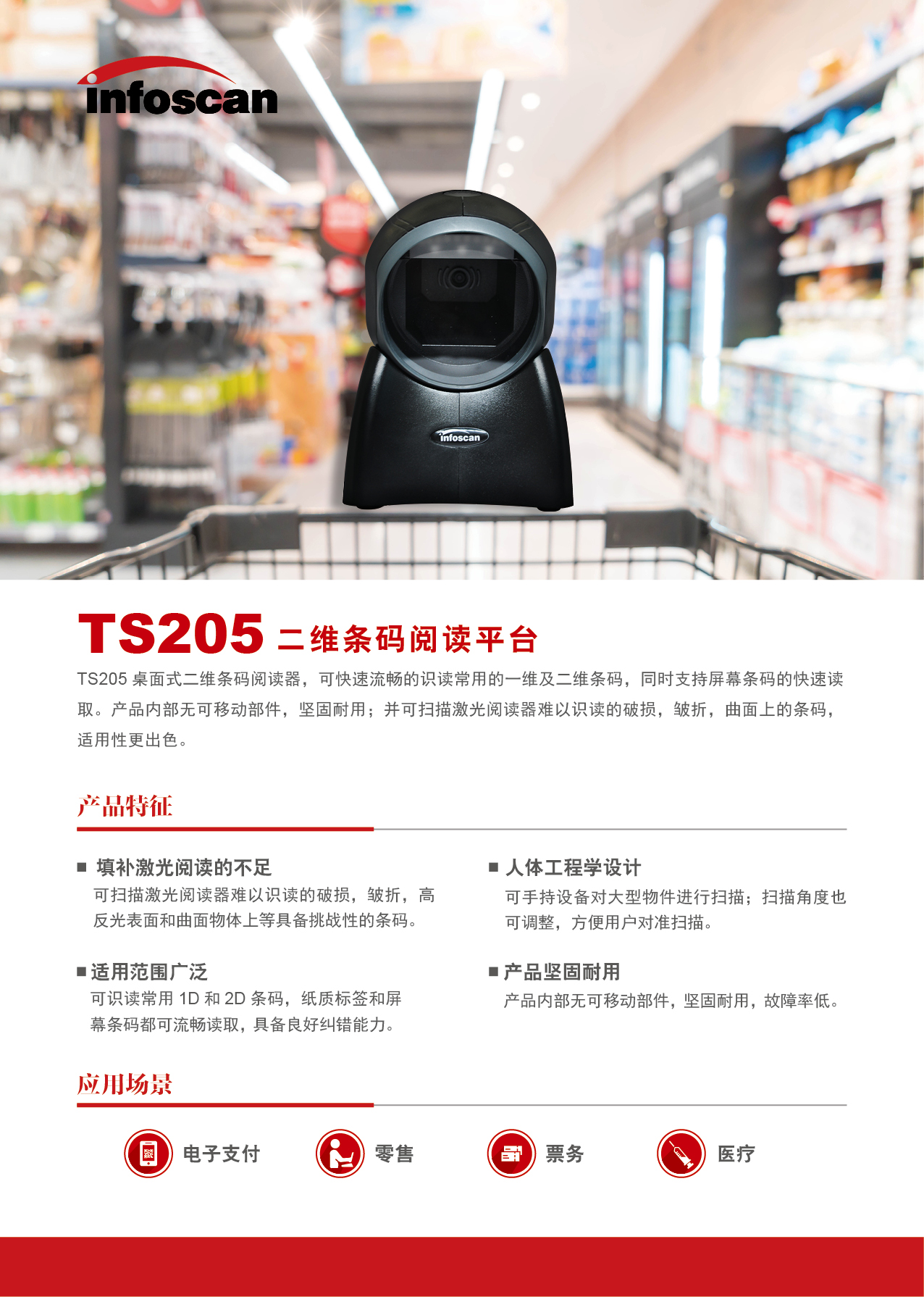 查看詳細TS205 桌面式二維條碼閱讀器,可快速流暢的識讀常用的一維及二維條碼,同時支持屏幕條碼的快速讀取。產(chǎn)品內(nèi)部無可移動部件,堅固耐用;并可掃描激光閱讀器難以識讀的破損,皺折,曲面上的條碼,適用性更出色。